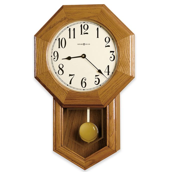 Schoolhouse wall clocks usually are finished in oak with an octagonal wall clock frame around the dial with a drop front and a swinging pendulum behind the glass.